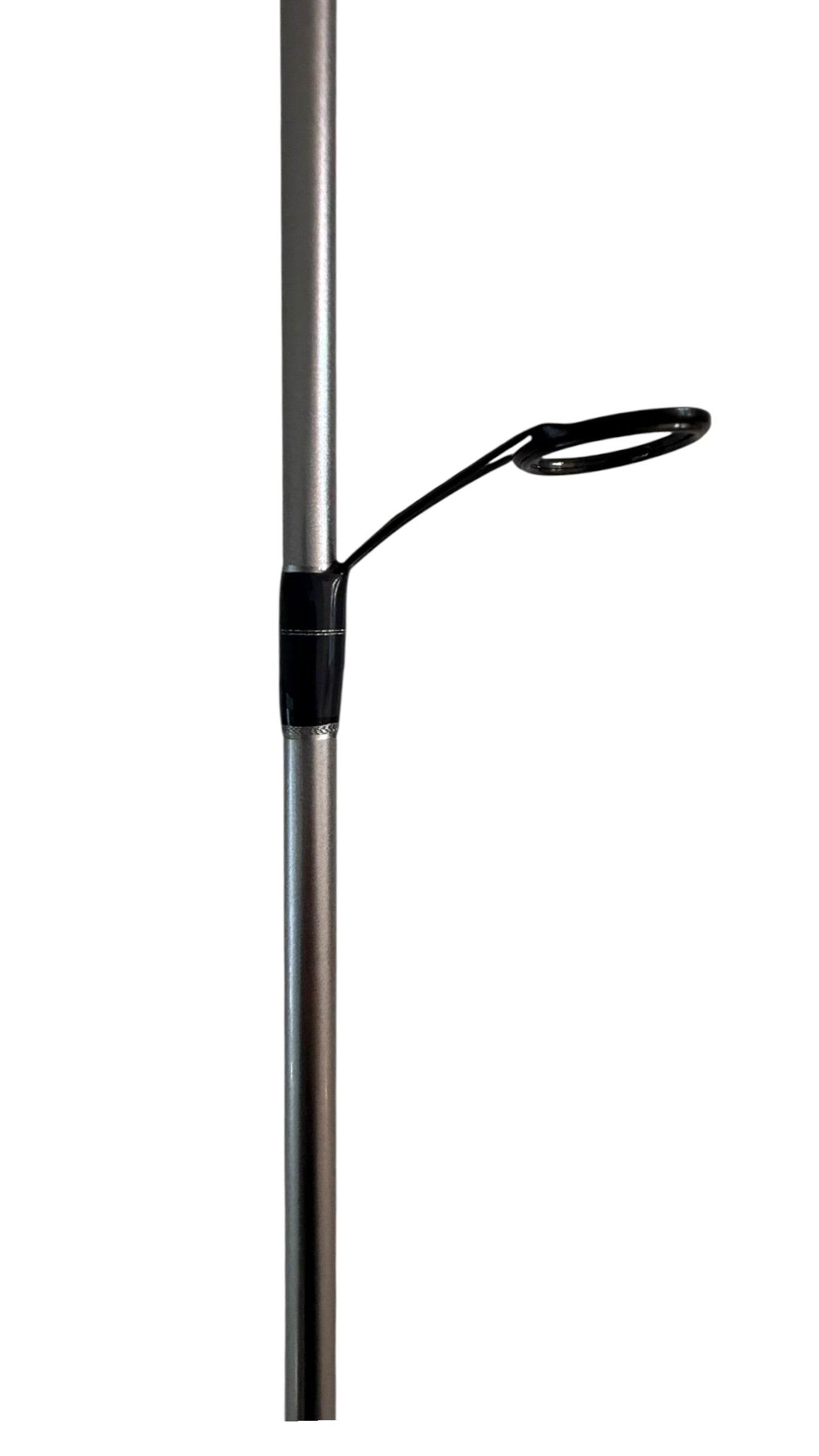Custom high-performance spinning rod for sale. Built with premium components and a sleek metallic silver/carbon fiber finish.